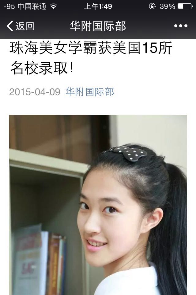 Apr 16, 2015 • X. H. 美女学霸! ## 好值得马克的一件事 我有个同学是美女,而且是学霸!! 不对,更正一下,是我的同学的女儿,囧。 有图有真相,学霸的妈妈邓同学是我念 MBA 时的同班同学;时光飞呐~~ 邓同学还好热情地请我们吃饭庆祝,是要马克的有木有!! 原文